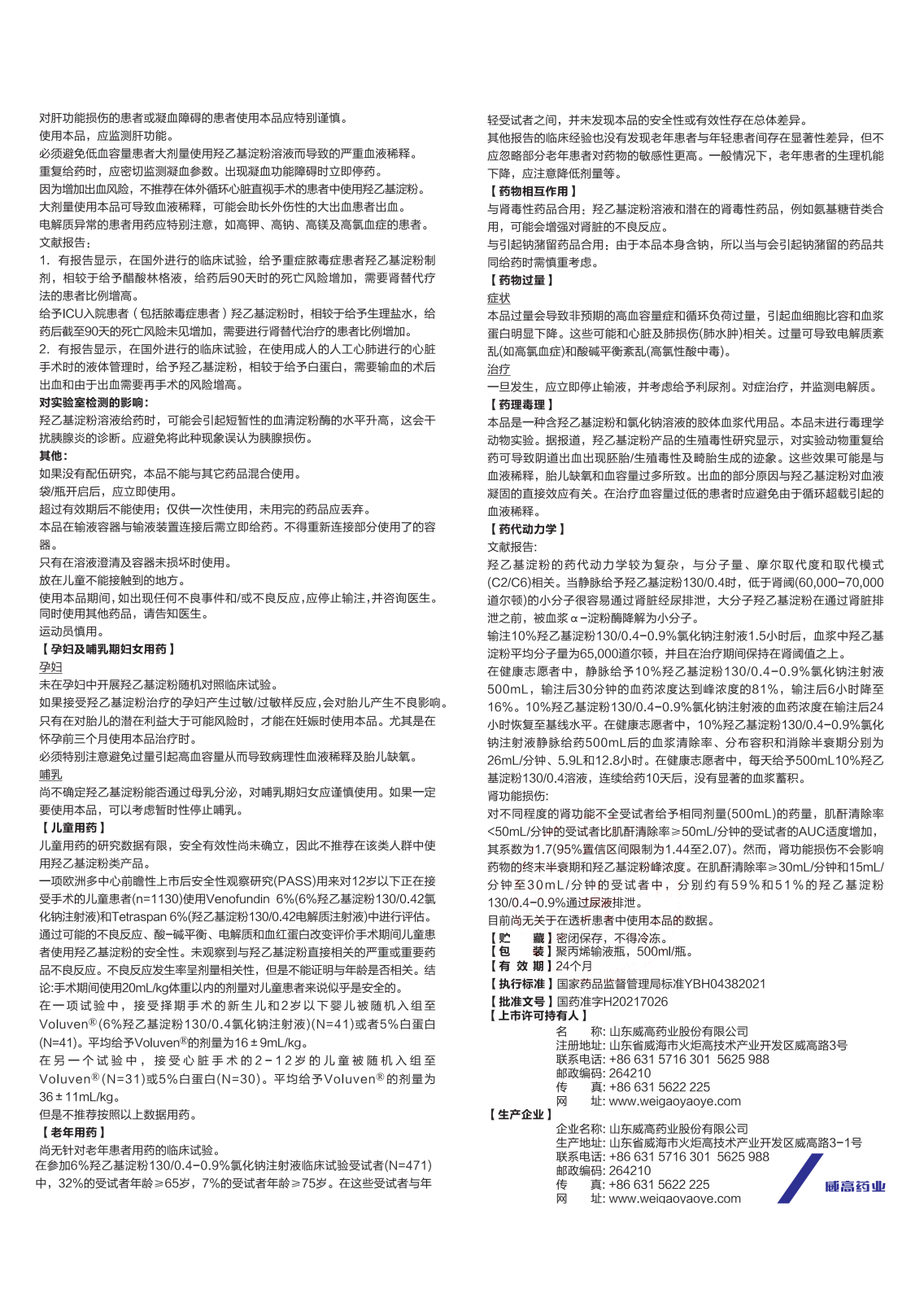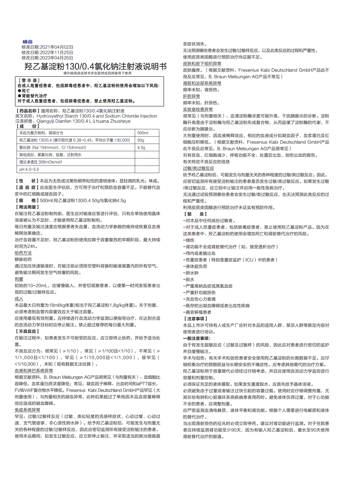 【规 格】500ml:羟乙基淀粉130/0.4 50g与氯化钠4.5g